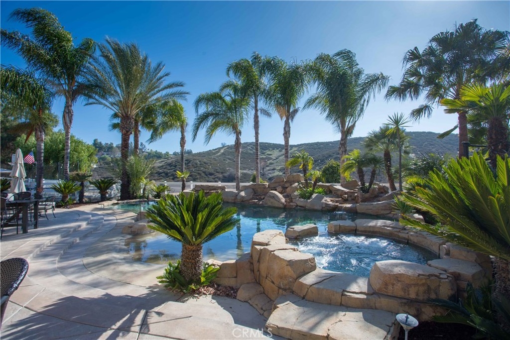 Resort-like backyard with a walk-in beach entry and five calming dramatic waterfalls built into the pebble tec 54’ sparkling pool and 12 person spa, beautifully appointed gazebo adjacent to the custom built-in wood fired outdoor pizza oven, covered patio to extend the living space to the outdoors. Grounds are landscaped with lush and mature trees with plenty of land with endless possibilities. This estate is a rare find with breathtaking views in a private and peaceful setting. All these with the lowest taxes and NO HOA. Minutes to Temecula wineries, shops & restaurants. An immaculate estate to call home!